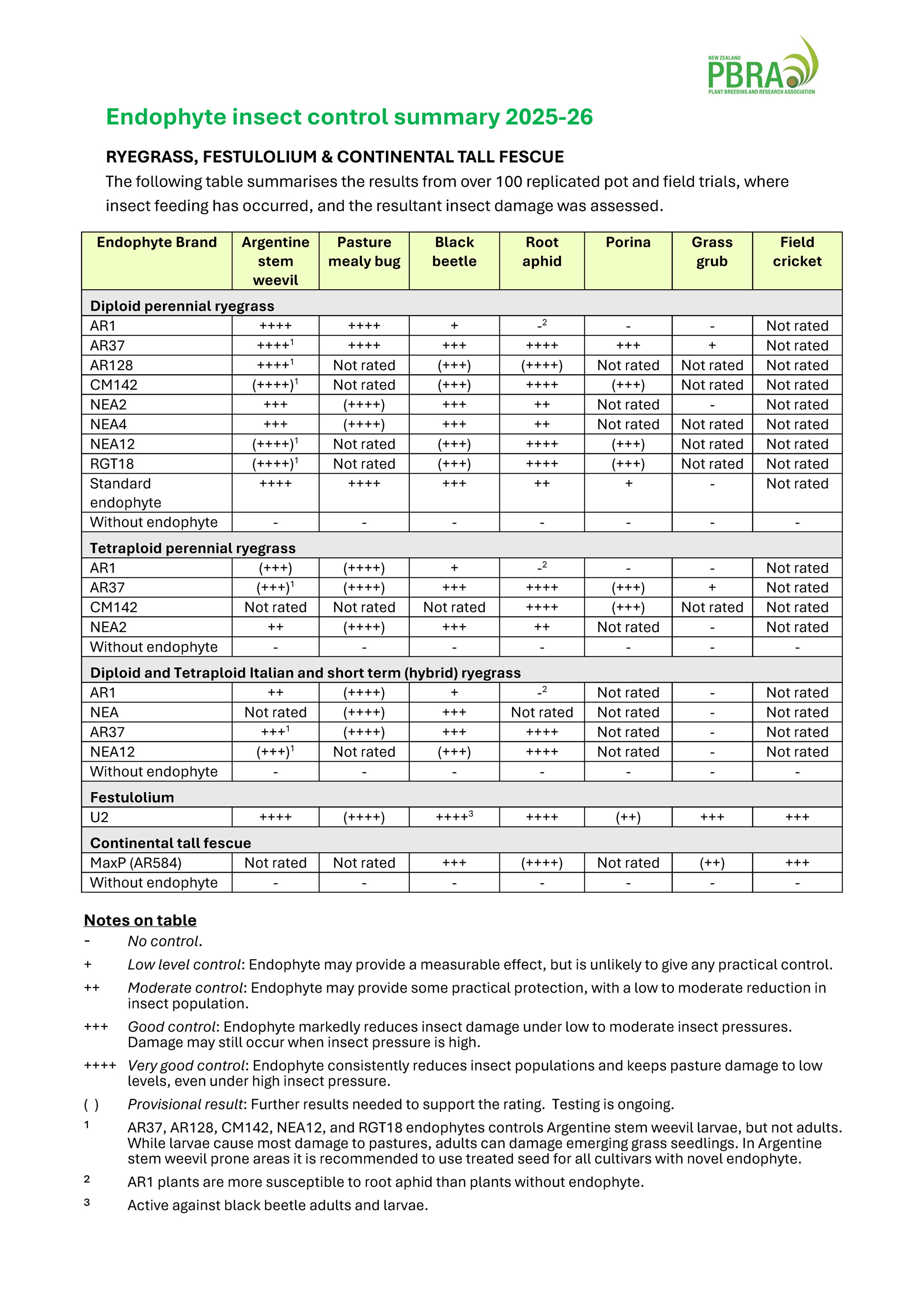 These ratings are indicative and may vary slightly between cultivars. If Argentine Stem Weevil or Black Beetle are present at sowing, an appropriate seed treatment is recommended to improve insect control during establishment. The ratings in this table are based in part on glasshouse studies where test plants are 100% infected with endophyte, whereas commercial seed is expected to meet minimum standards of 70% of seeds infected. This table has been approved by the New Zealand Plant Breeding and Research Association (NZPBRA)